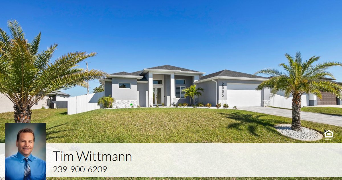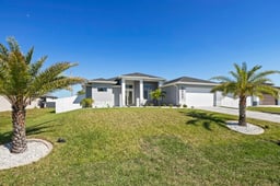 Beautiful 3 Bedroom 2.5 bath, Custom Built in 2023 Luxury Home, NOT IN a FLOOD ZONE, located in the highly desired Cape Coral Florida. Upon arriving you will be amazed by the contemporary look, professionally landscaping with the majestic palm trees, covered porch and paver driveway. After entering through the double glass doors of the home it is even more impressive, featuring a bright and Open Floor Plan with tall tray ceilings and high end finishings, Impact Windows and Doors, remote blinds and many other upgrades. The kitchen offers a waterfall Island, walk-in pantry, stainless steel appliances, granite counter tops and backsplash. This home has a huge Primary Bedroom with 2 walk-in closets, and an en-suite with dual sinks, soaking tub, and a custom tiled shower with glass doors. The guest bedrooms are located on the other side of the home for your privacy and convenience and the guest having access to the kitchen and pool area. The outdoor space is great for entertainment with the in-ground pool, outdoor kitchen also having granite counter tops, Outdoor TV, Upgraded Clear View Screened in Pool Cage, and the fenced yard will be great for kids, pets or just the privacy. More added features included UV light & platinum aerator water purifier, generator hook up, Whole house surge protector and lawn irrigation system. Conveniently located near shopping, restaurants, hospitals and entertainment areas, with a short drive to Sanibel and Fort Myers Beach. This will make a great Primary home, Vacation home or Rental. (This home was recently built and purchased for a much higher price, but the seller is being relocated for his job, since the purchase the seller added the pool cage and other upgrades. THIS HOME WILL NOT LAST LONG